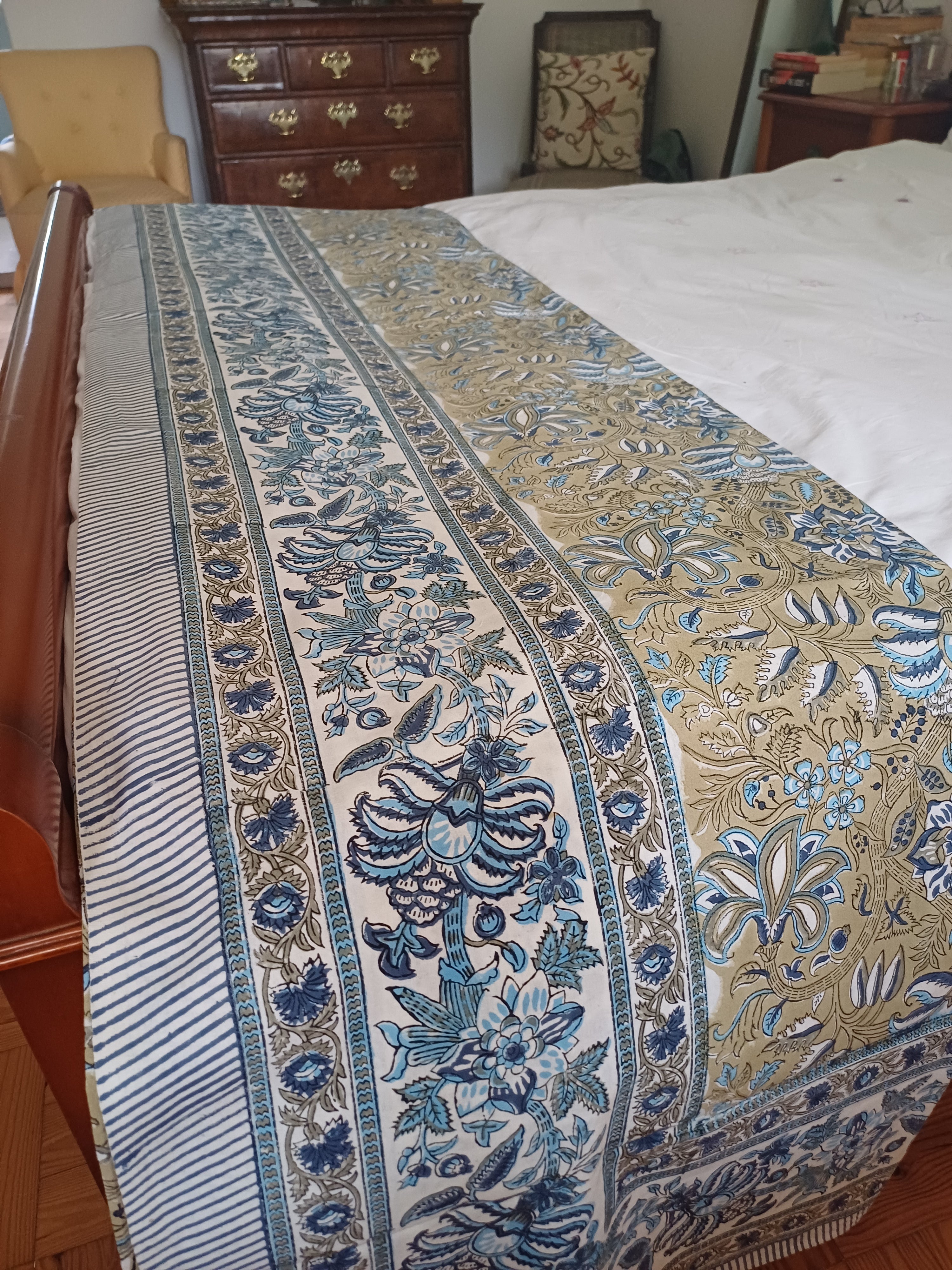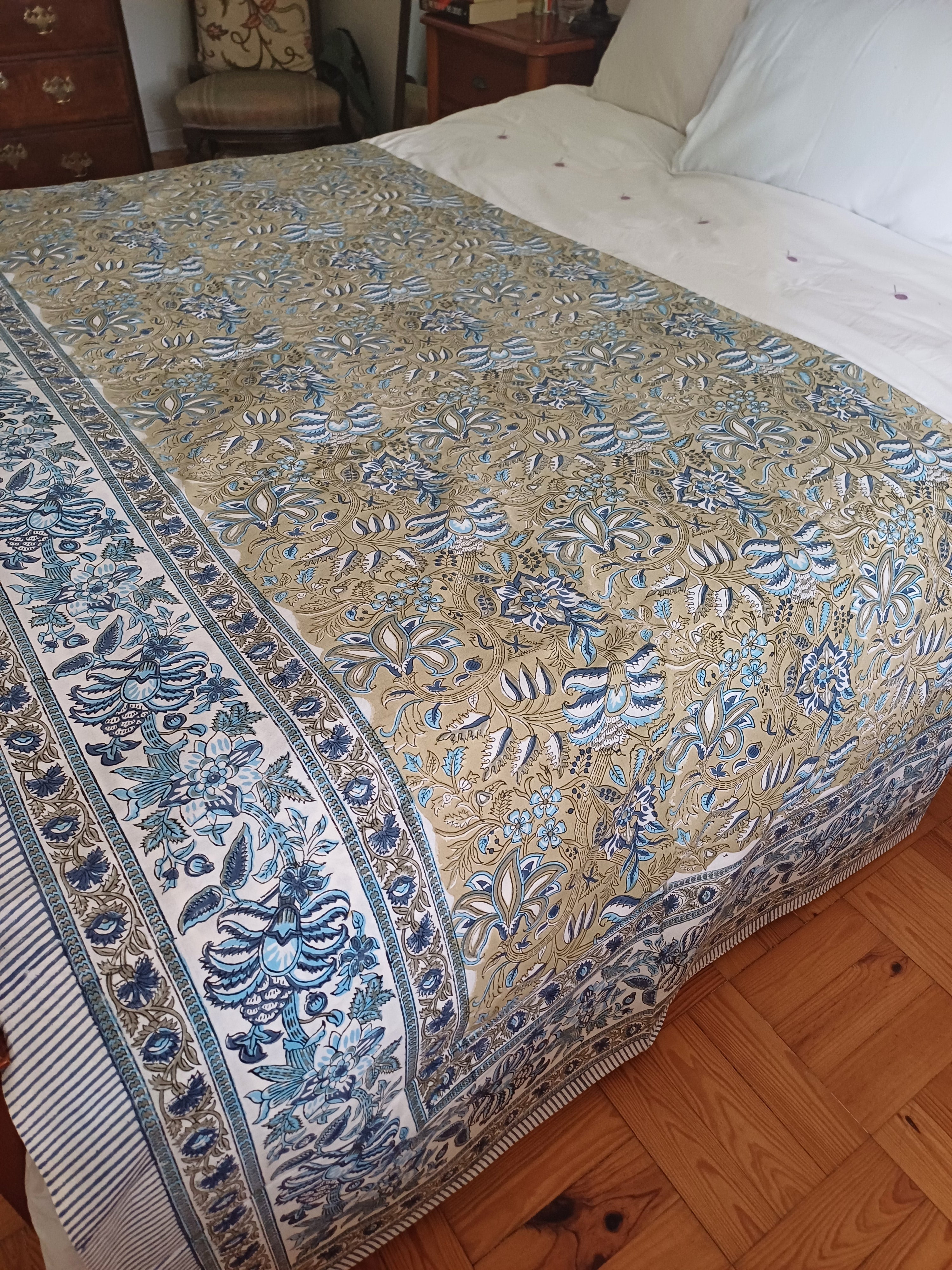 A 100% cotton block print bedspread inspired by Mughal designs from India is a beautiful and intricate piece of traditional craftsmanship.