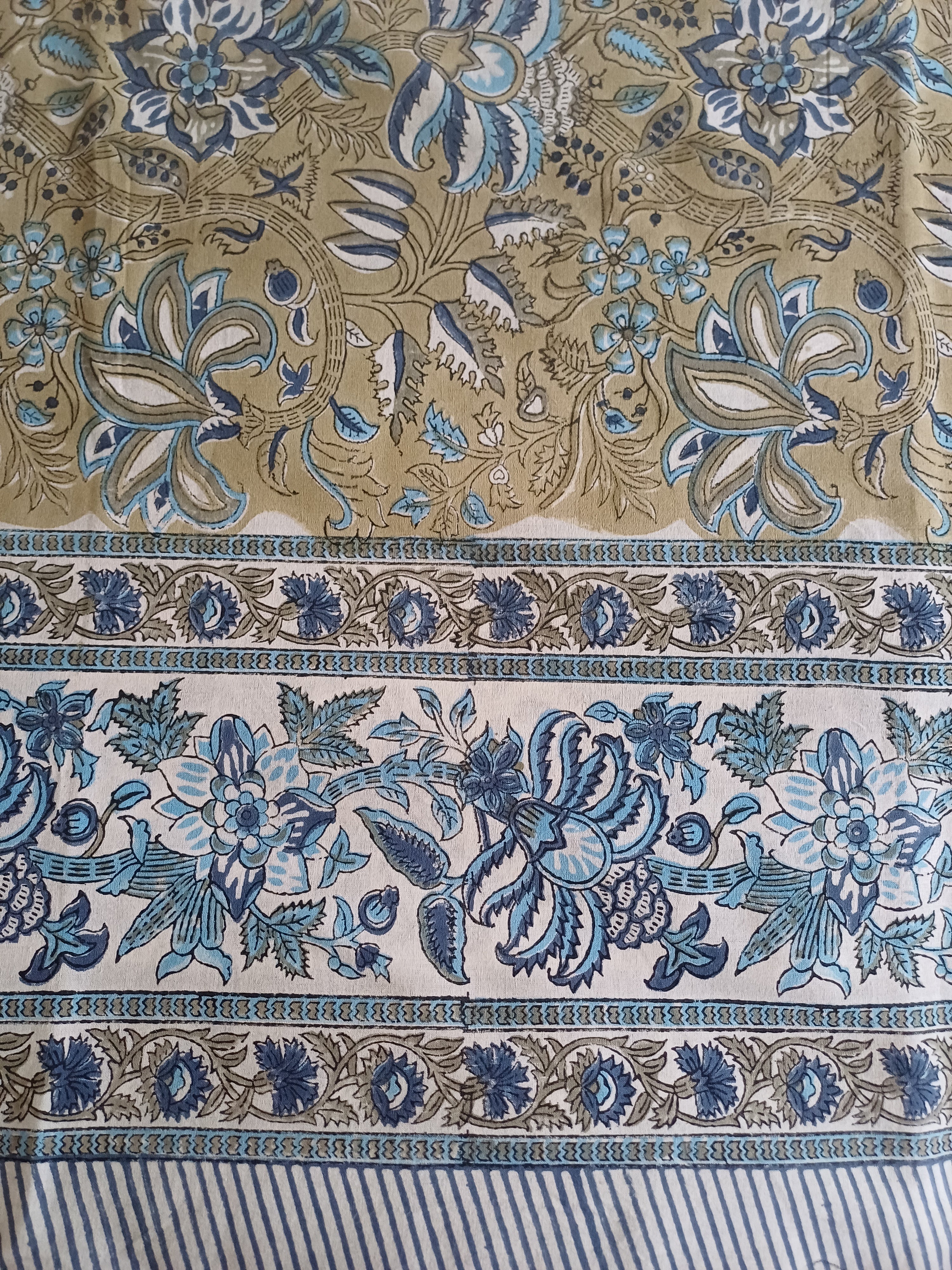 Block Printing Technique: The patterns are created using a block printing technique, where hand-carved wooden blocks are dipped in dye and stamped onto the fabric. This method ensures each piece is unique with subtle variations that add to its charm.