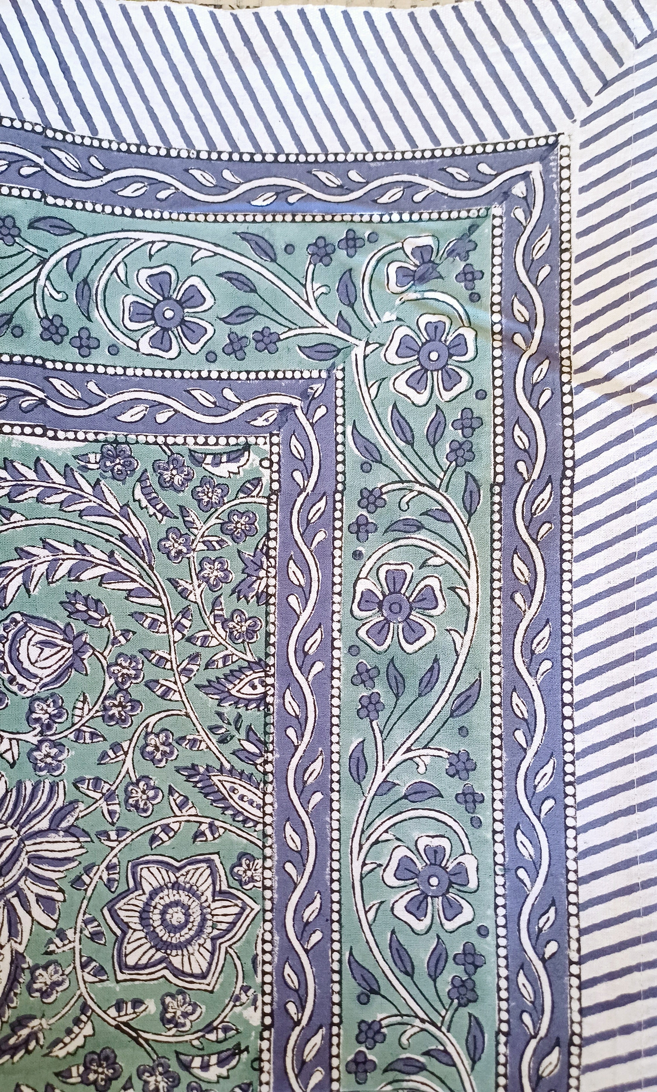 This vibrant 100% cotton table cover features a stunning Indian block-print design inspired by the majestic Mughal Empire. The intricate patterns and motifs, reminiscent of ancient Islamic art, are skilfully rendered in a palette of rich colours. The cover’s beauty is further enhanced by the traditional block-printing technique, which adds a unique texture and character to the fabric.