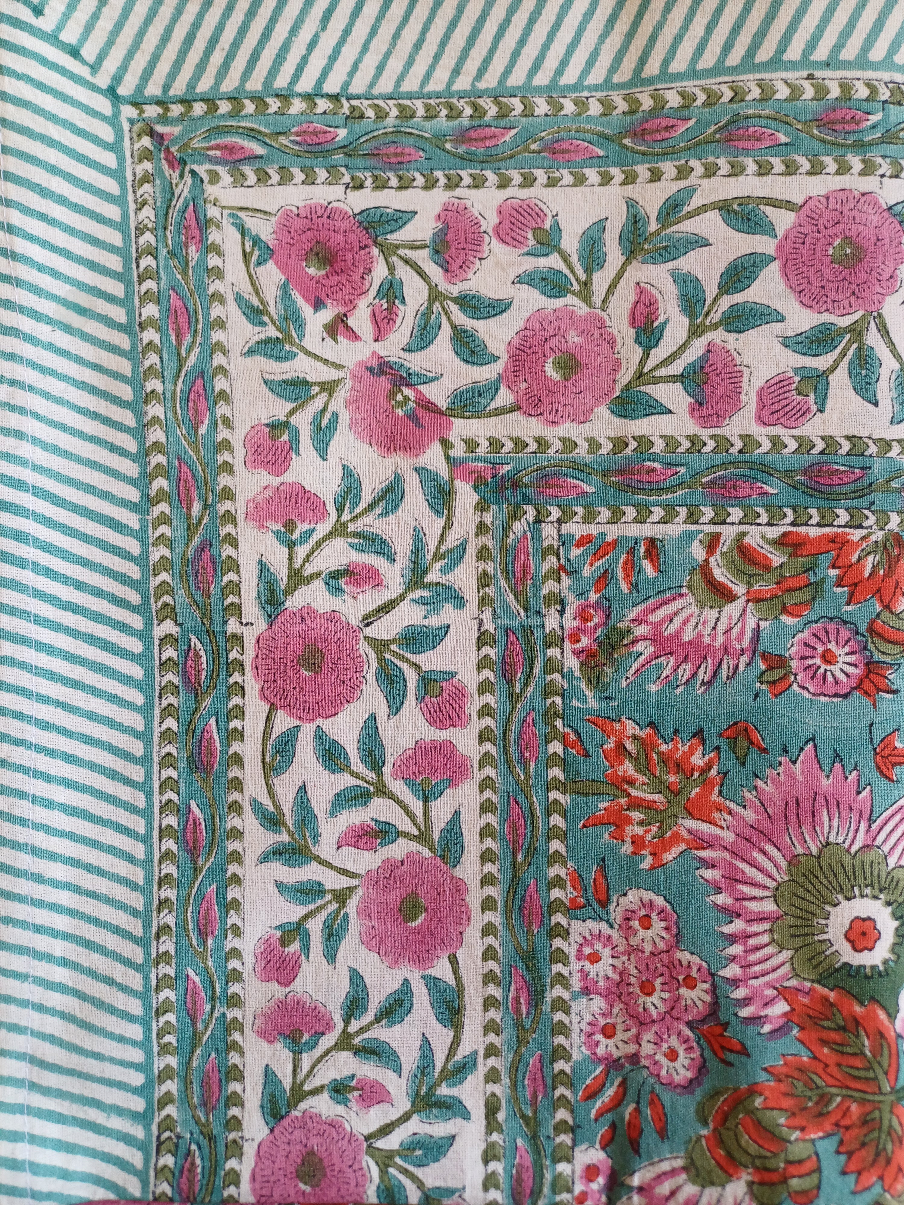 This vibrant 100% cotton table cover features a stunning Indian block-print design inspired by the majestic Mughal Empire. The intricate patterns and motifs, reminiscent of ancient Islamic art, are skilfully rendered in a palette of rich colours. The cover’s beauty is further enhanced by the traditional block-printing technique, which adds a unique texture and character to the fabric.